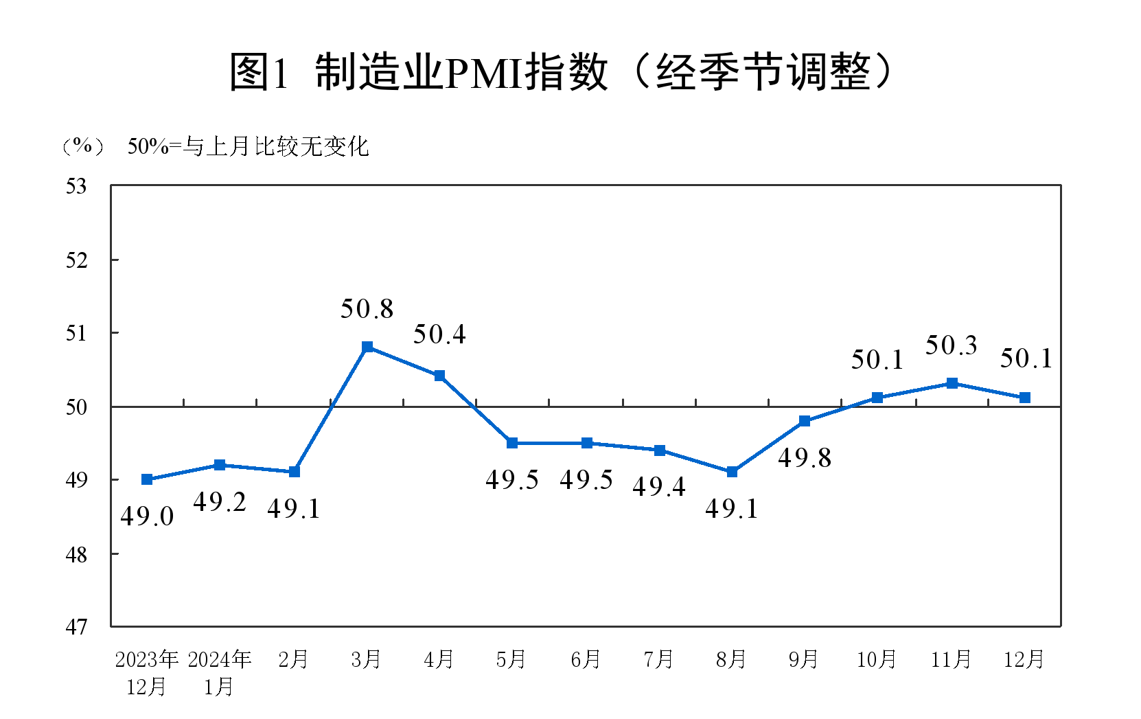 国家统计局发布12月PMI数据,制造业采购经理指数(PMI)为50.1%,非制造业商务活动指数为52.2%,均显示扩张态势。制造业需求逐步恢复,非制造业景气水平明显提升,经济景气度有望延续上升势头。