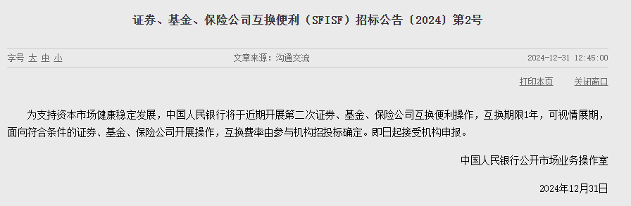 人民银行12月31日宣布,为进一步推动资本市场健康稳定发展,中国人民银行将于近期启动第二次证券、基金、保险公司互换便利操作,期限为1年,并可根据情况延长,面向符合资格的证券、基金、保险公司实施,互换费率将通过参与机构的招投标方式确定。即日起,相关机构可开始申报。