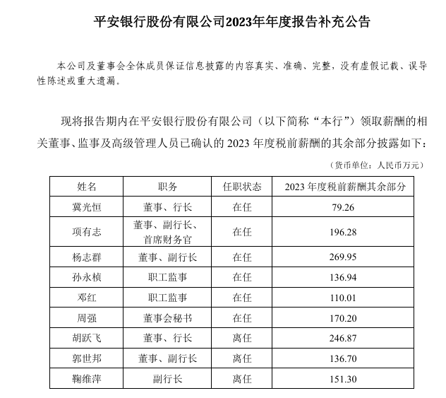 平安银行近日发布的2023年年度报告补充公告显示,该行多名高管获得了高额的税前薪酬补发。其中,杨志群的补发金额最高,达到269.95万元。此外,前行长胡跃飞也获得了246.87万元的补发金额。现任行长冀光恒则补发了79.26万元,使得其税前薪酬总额达到158.52万元。其余6名高管的年薪补发部分均超过百万元。