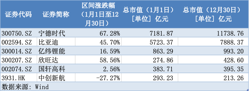 截至12月30日收盘,全球动力电池厂商排名前十中的六家中国企业,全年股价涨跌互现,呈现分化态势。股市作为经济和企业经营状况的晴雨表,一定程度上揭示了各企业发展面临的挑战。宁德时代市值稳居榜首,达到1.17万亿元,年内股价反弹显著,增长幅度高达67.28%,市值超过其余五家动力电池厂商之和。
