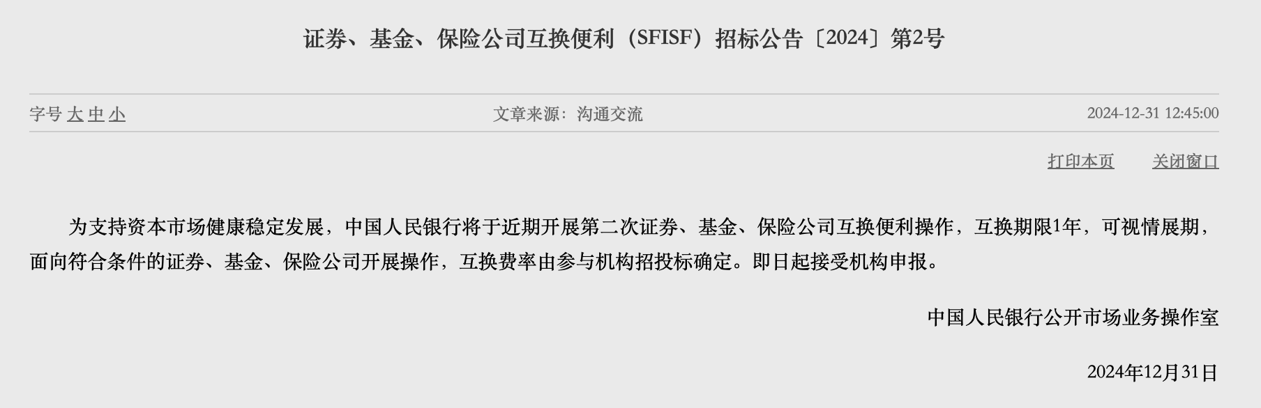 12月31日,中国人民银行正式宣布,为进一步推动资本市场健康稳定发展,将于近期推行第二次证券、基金、保险公司之间的互换便利操作。此次互换期限为1年,可视情况延长,面向符合资格的证券、基金、保险公司开放,互换费率由参与机构通过招投标方式确定。即日起,相关机构可开始申报。