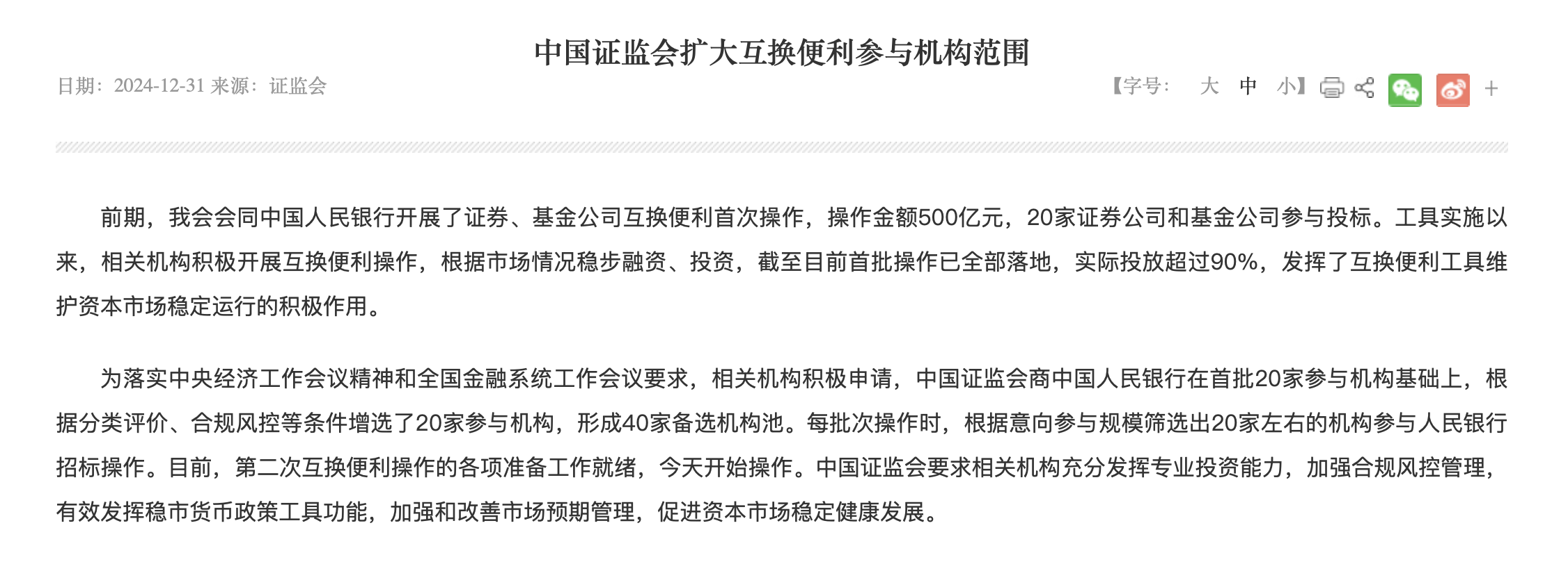 为深入贯彻中央经济工作会议精神和全国金融系统工作会议要求,相关机构积极申请参与。中国证监会与中国人民银行在首批20家参与机构的基础上,根据分类评价、合规风控等条件,增选了20家机构,形成了40家备选机构池。每批次操作时,将筛选出约20家机构参与人民银行的招标操作。目前,第二次互换便利操作的所有准备工作已就绪,并已正式开始操作。中国证监会要求相关机构充分发挥其专业投资能力,加强合规风控管理,有效利用稳市货币政策工具,改善市场预期管理,共同推动资本市场稳定健康发展。