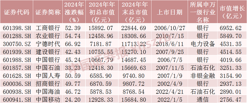 市值增长方面,银行股大放异彩。工商银行、农业银行等大盘股表现突出,其中工商银行市值增加超6900亿元,涨幅达52.39%。在市值增长最多的前10只股票中,有5只为银行股。