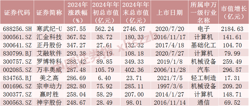 涨幅方面,剔除新股后,A股共有2194只股票实现正增长,其中329只涨幅超过50%。寒武纪-U以387.55%的涨幅位居榜首,汇金科技、正丹股份涨幅均超过340%。这些涨幅居前的股票主要分布在电子、计算机、基础化工等行业。