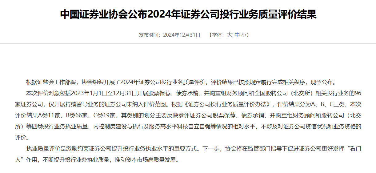 券商2024年投行业务、债券业务及财务顾问业务的执业质量评价结果已正式揭晓。作为激励券商提升执业水平的关键机制,执业质量评价在中证协官网于12月31日发布的结果中详细列出: