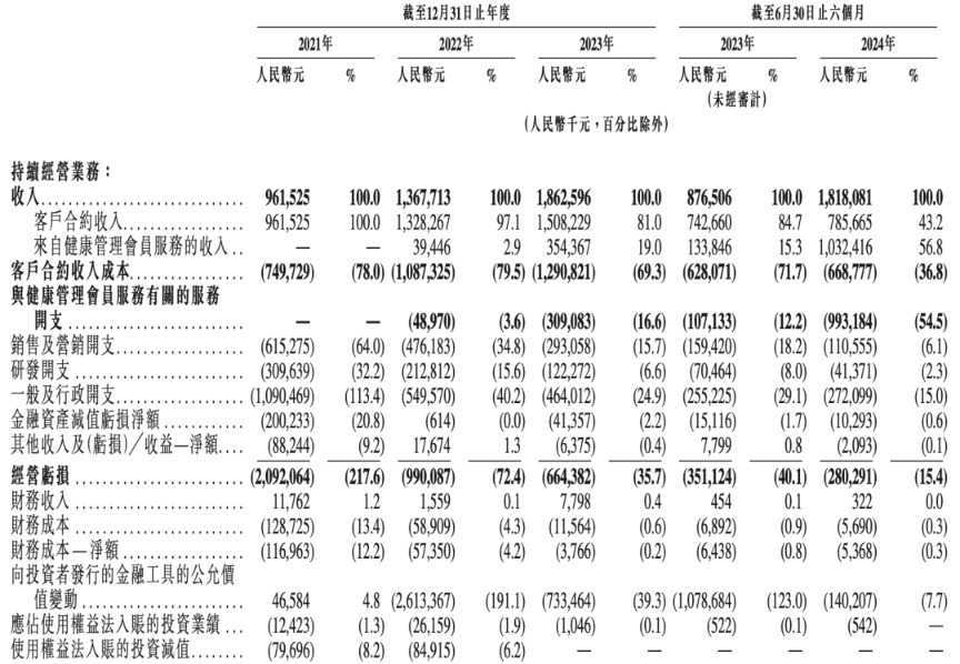 招股书显示,微医控股近年来收入持续增长,2021年至2023年,持续经营业务收入分别为9.62亿元、13.68亿元和18.63亿元。然而,尽管收入高速增长,公司在这几年仍面临亏损。不过,经调整亏损率已逐年收窄,从2021年的140.8%降至2023年的27.1%。