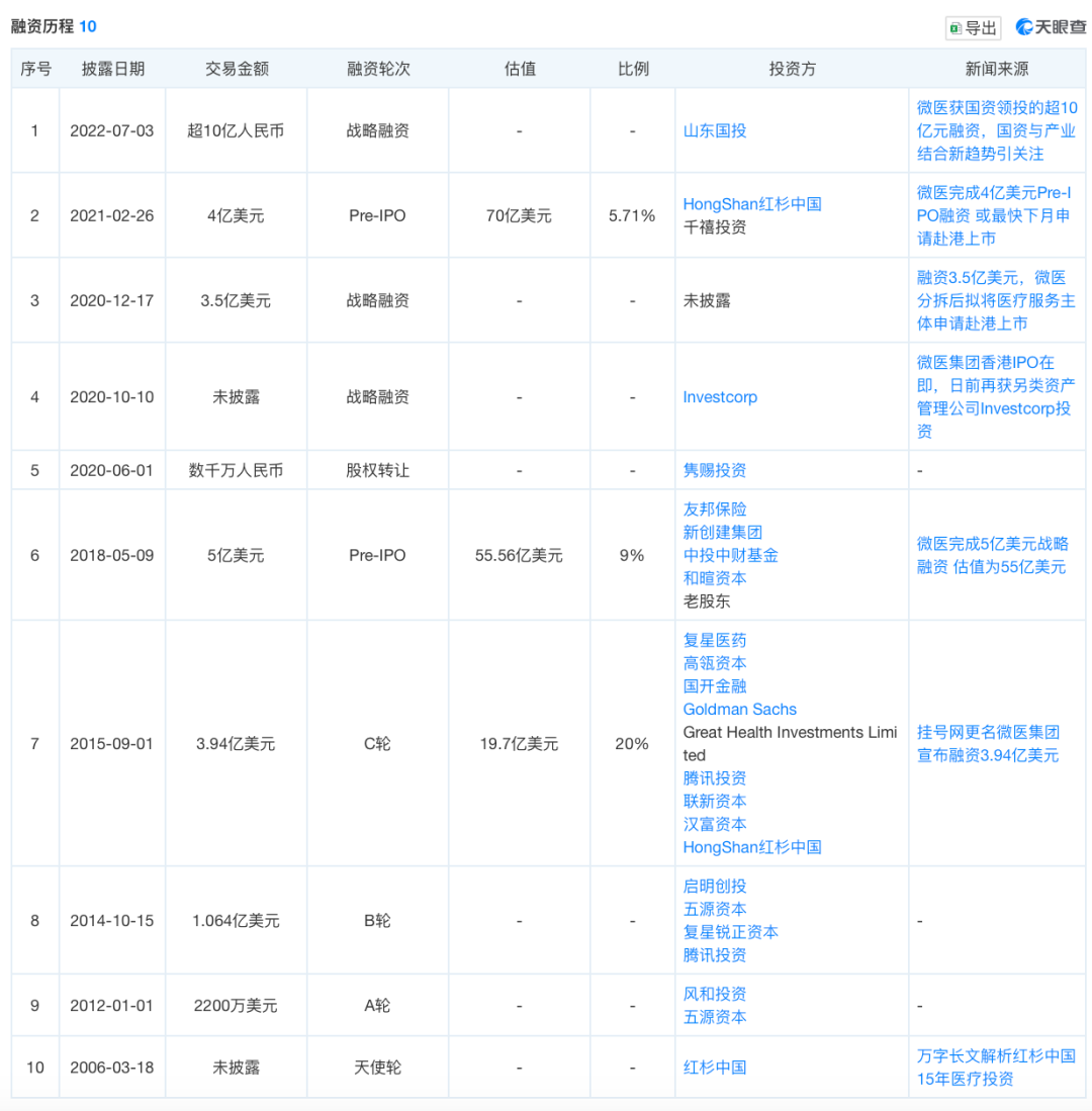 自成立以来,微医控股已完成10轮融资,吸引了包括腾讯、高瓴、中投中财基金、友邦保险、启明创投、红杉中国等在内的众多知名机构的投资。招股书显示,微医的重要股东还包括高盛集团等。