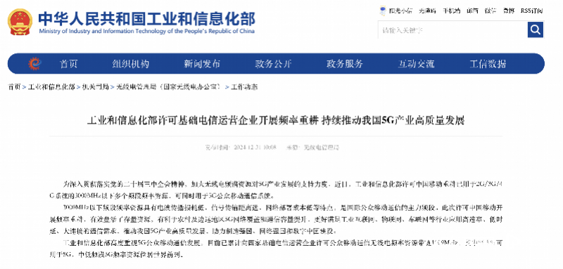工信部许可中国移动对3000MHz以下已用于2G/3G/4G系统的多个频段频率资源进行重耕,用于5G公众移动通信系统,助力5G产业高质量发展。