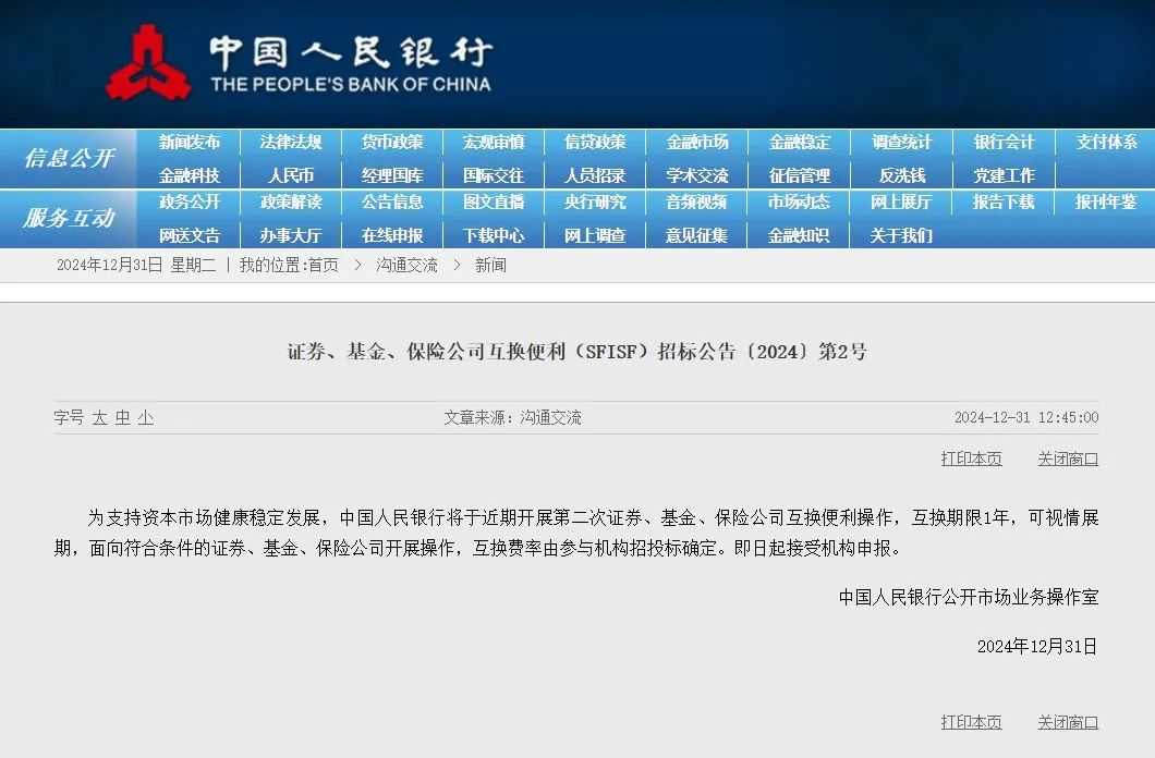 近日,中国人民银行官网发布重磅消息,为继续支持资本市场健康稳定发展,该行计划于近期推行第二次证券、基金、保险公司互换便利操作。此次互换操作期限为1年,并具备视情况展期的灵活性,面向所有符合条件的证券、基金、保险公司开放。互换费率将通过参与机构的招投标方式确定,并已即日起开始接受机构申报。