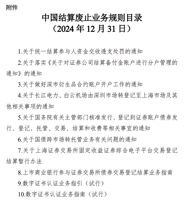 12月31日,中国证券登记结算有限责任公司(简称“中国结算”)正式对外发布公告,宣布将废止包括《关于统一结算参与人资金交收透支处罚的通知》在内的10项业务规则,这一决定旨在进一步优化市场规则体系,提升市场运行效率。废止决定将于2024年12月31日正式生效。