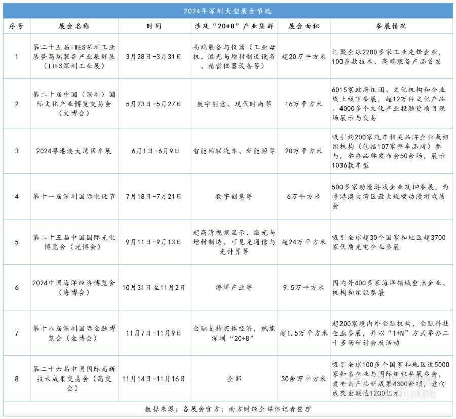 深圳会展业逐步走向细分化、专业化。深圳提出构建“一集群、一展会(论坛)”体系,2023年深圳战新和未来产业直接相关展会超120场,展览面积超800万平方米。2024年前三季度,深圳已举办73场“20+8”主题展会,预计全年覆盖22个产业。