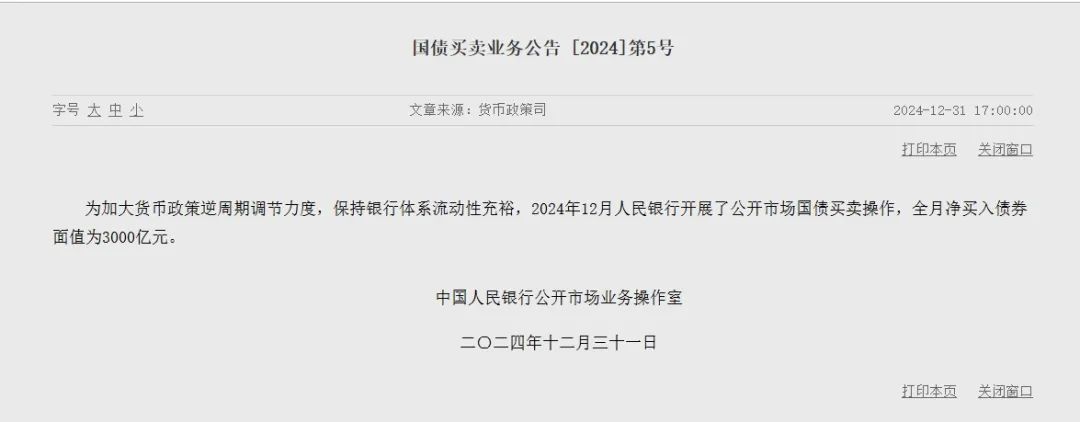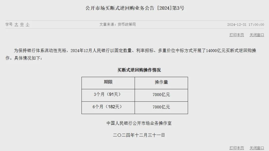 12月31日,央行发布公告称,为保持流动性充裕,2024年12月人民银行以固定数量、利率招标、多重价位中标方式,开展了总额达14000亿元的买断式逆回购操作,分为3个月和6个月期限,各7000亿元。同日,央行还开展了公开市场国债买卖操作,全月净买入债券面值为3000亿元。