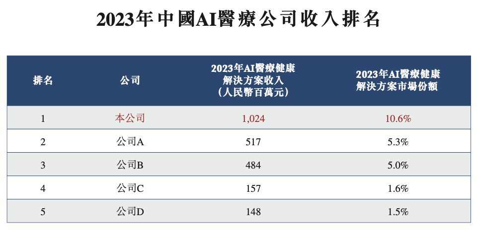 招股书显示,2023年微医控股AI医疗健康解决方案收入达10.24亿元,位居市场首位。