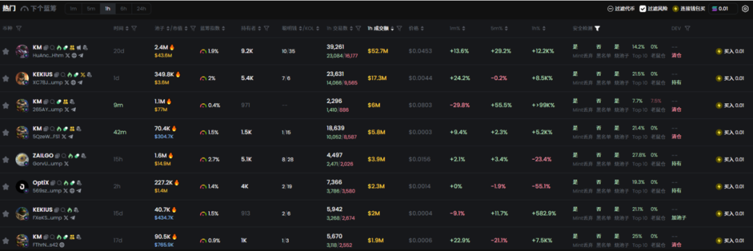 根据GMGN.AI的数据,在马斯克更改用户名并发布相关推文后,$KM(KekiusMaximus)的概念加密代币立即吸引了市场的广泛关注。在短短几个小时内,KM代币的市值迅速突破4000万美元,短期涨幅高达11200%,24小时交易量更是达到1.08亿美元,成为Solana链上炙手可热的Meme代币。与此同时,另一个与“KekiusMaximus”概念相关的代币KEKIUS也在以太坊链上出现,并随着马斯克的再次提及而价格飙升,市值一度攀升至7600万美元。