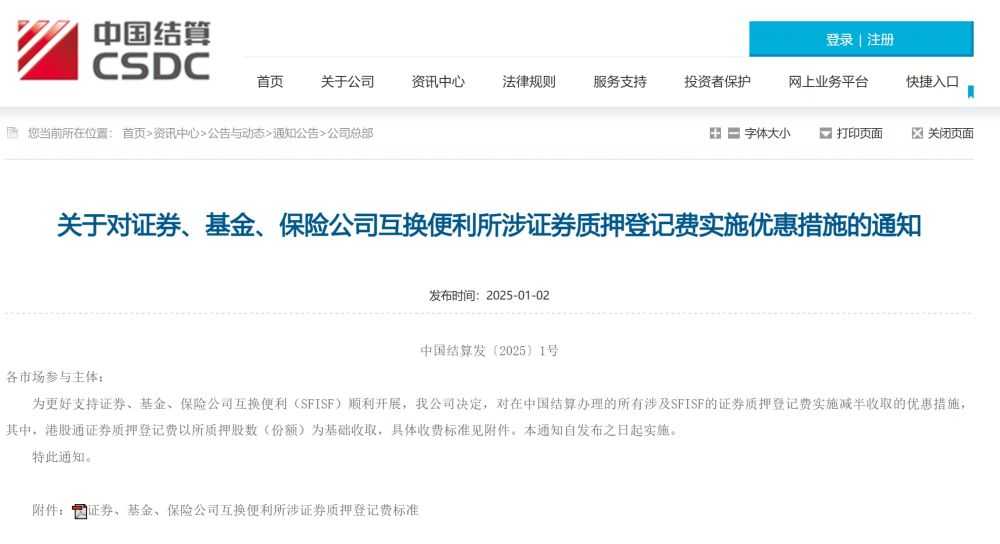 中国结算为支持证券、基金、保险公司互换便利(SFISF),对所有涉及SFISF的证券质押登记费实施减半收取优惠,港股通证券质押登记费同样享受减半优惠。