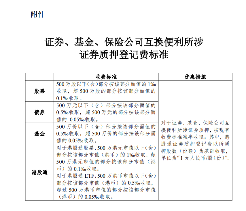 根据通知内容,中国结算决定对所有涉及SFISF的证券质押登记费实施减半收费的优惠政策。特别指出,港股通证券质押登记费将基于所质押的股数(份额)进行计费,并提供了详细的收费标准作为附件。该优惠措施自通知发布之日起即刻生效。