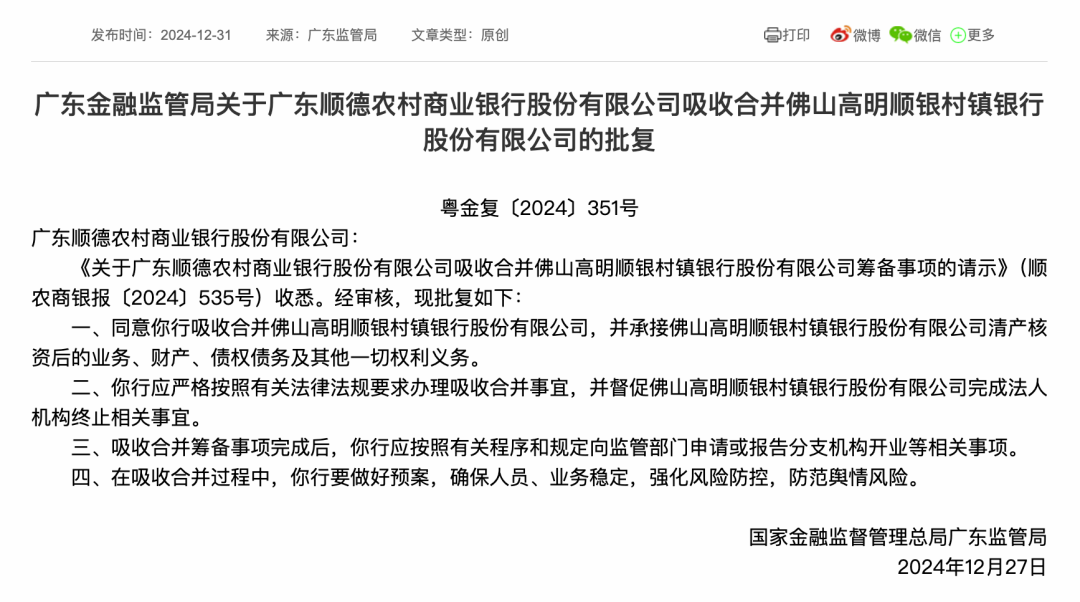 金融监管总局披露,广东顺德农商银行和铜陵农商银行分别获批吸收合并两家村镇银行,标志着中小银行改革化险工作取得新进展,同时运城农信社也获批解散。