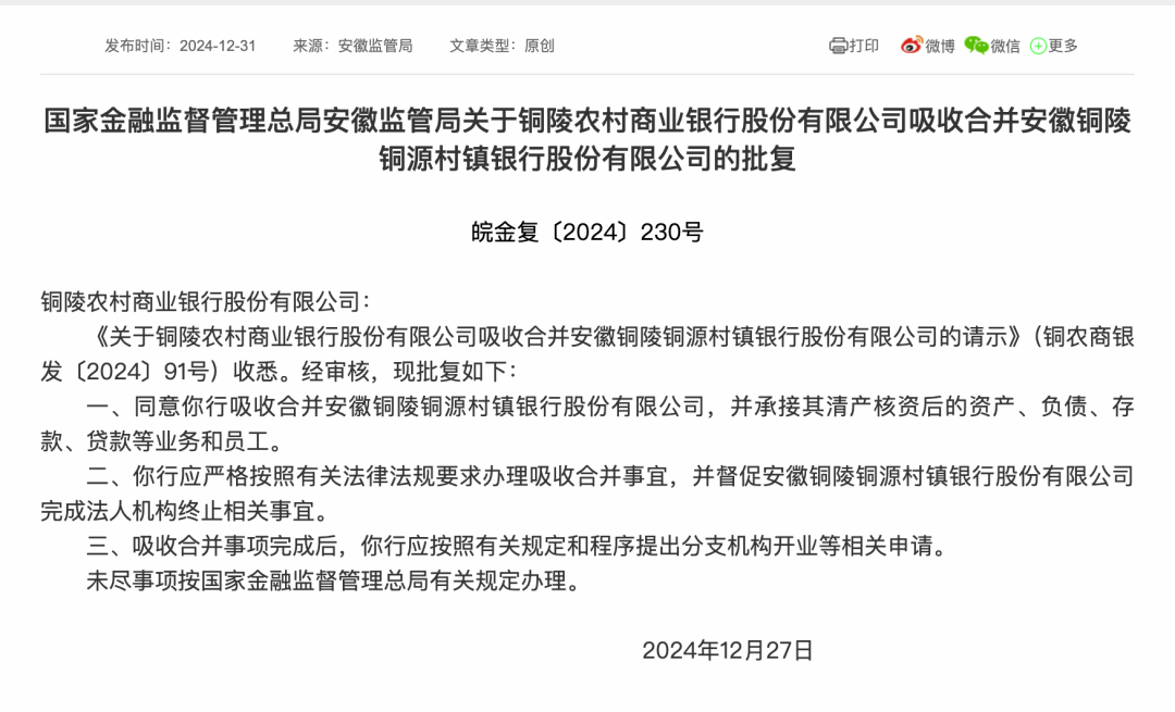 铜陵农商银行同样获批吸收合并安徽铜陵铜源村镇银行