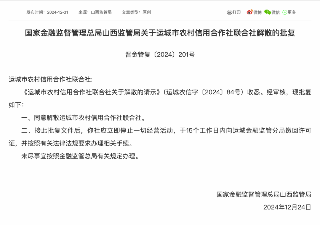 此外,山西金融监管局也在2024年12月24日作出了批复,同意运城市农村信用合作社联合社解散。该局要求运城农信社立即停止一切经营活动,并在15个工作日内向运城金融监管分局缴回相关许可证,同时按照有关法律法规要求办理相关解散手续。这一决定标志着运城农信社将正式退出历史舞台,为地区金融市场的进一步整合和优化提供了契机。