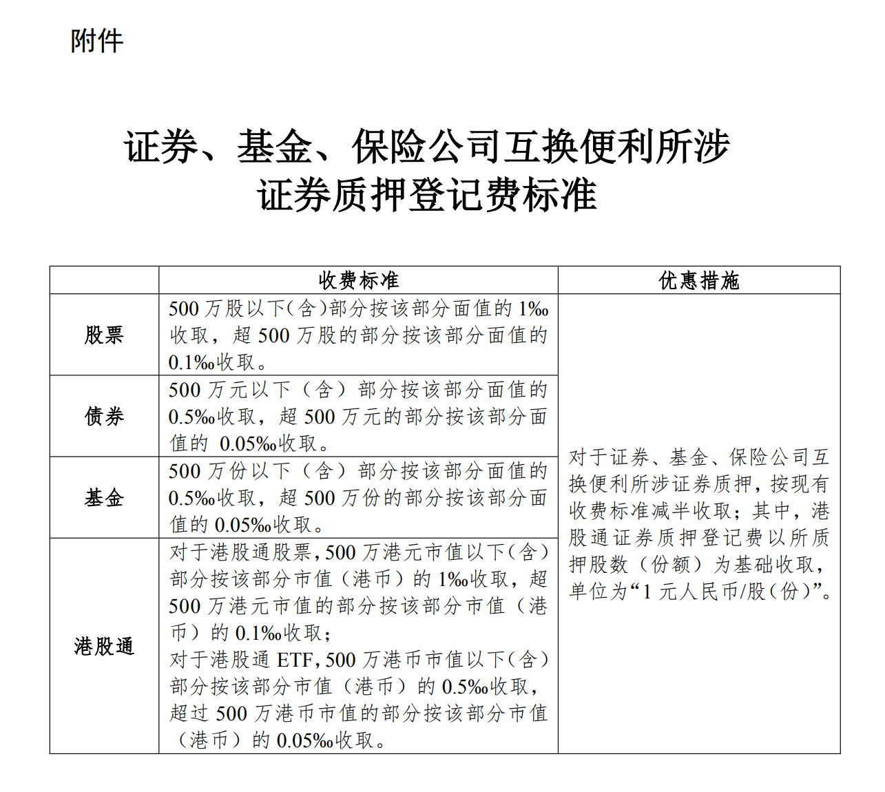 在股票方面,质押登记费收取标准调整为:500万股及以下部分按面值的1‰计费,超过500万股部分则按0.1‰计费。基金方面,500万份及以下部分按面值的0.5‰计费,超过500万份部分按0.05‰计费。