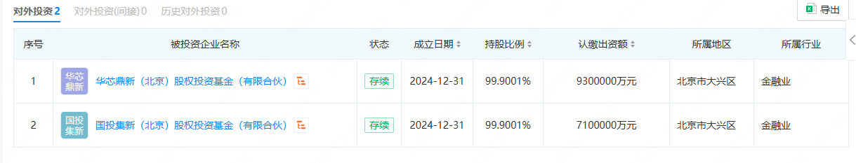具体来看,华芯鼎新(北京)股权投资基金(有限合伙)由国家集成电路产业投资基金三期股份有限公司和华芯投资管理有限责任公司共同出资设立,其中前者出资930亿元,后者出资9300万元,并由华芯投资担任执行事务合伙人。