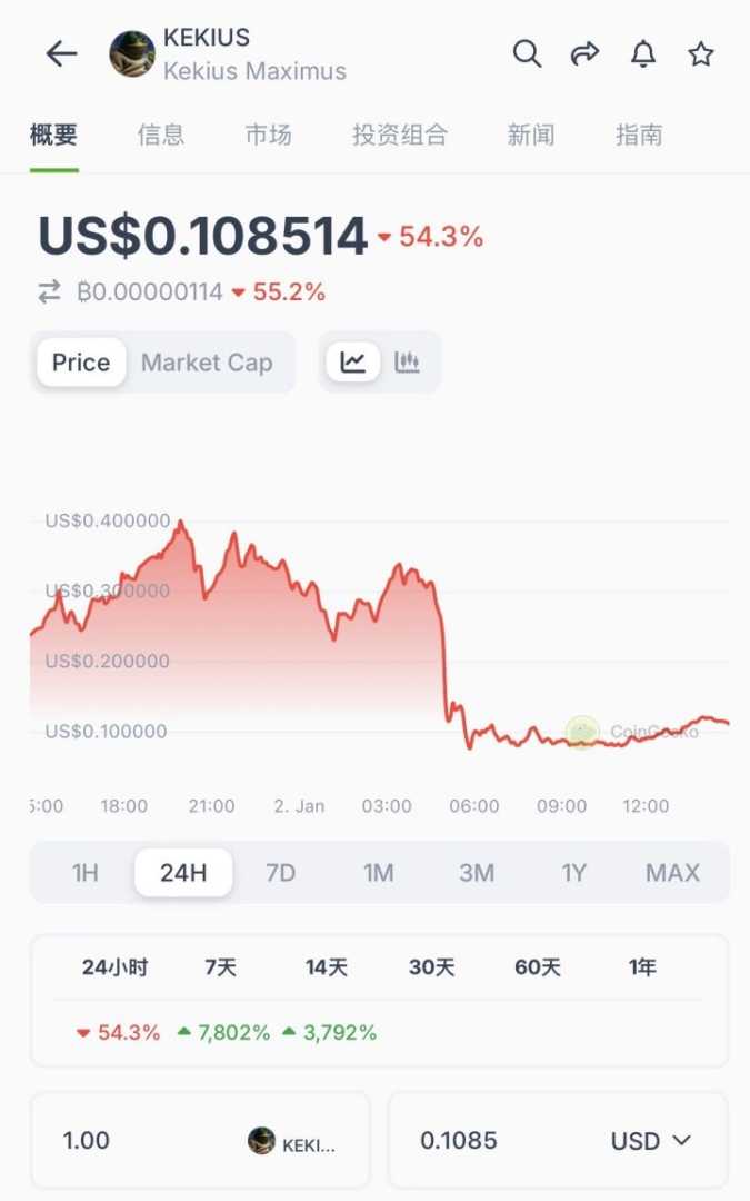 1月2日,截至14点46分,据CoinGecko数据显示,与特斯拉CEO马斯克更改昵称“Kekius Maximus”同名的模因币价格已大幅下跌至约0.1085美元,24小时内跌幅高达54.3%。