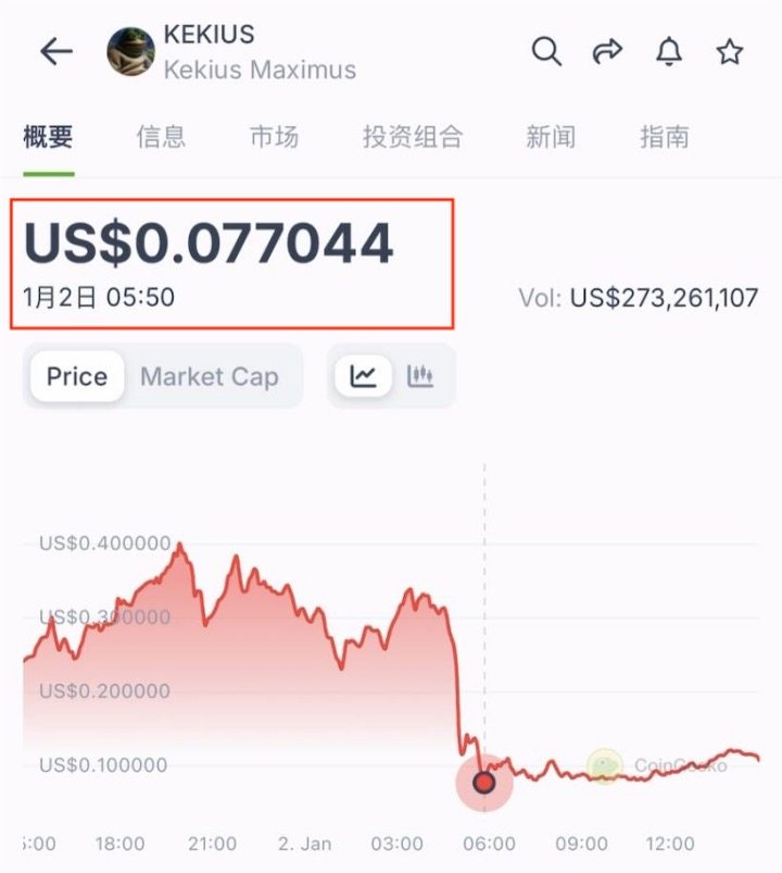 然而,市场风云变幻。当地时间1月1日,马斯克将其在X平台的昵称改回原名Elon Musk。受此影响,Kekius Maximus价格出现剧烈波动。1月2日凌晨5点左右,该代币价格出现“断崖式”下跌,一度跌至0.077美元。