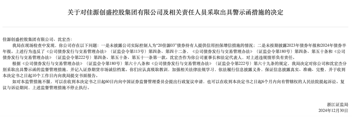 浙江证监局对佳源创盛未披露信用担保增信措施和未按期披露债券年报的行为,以及对中证鹏元在债券评级工作中未勤勉尽责的行为,分别采取了出具警示函的措施。