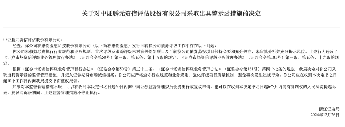 同时,浙江证监局对中证鹏元也发出了警示函。在思创医惠科技股份有限公司发行可转换公司债券的评级工作中,中证鹏元未勤勉尽责执行行业规范和业务规则,未对有关创新项目及可转换公司债券募投项目保持必要和充分关注,也未审慎分析并充分揭示风险,违反了《证券市场资信评级业务管理暂行办法》和《证券市场资信评级业务管理办法》的相关规定。