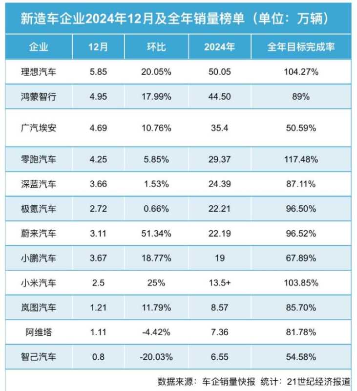 2024年新造车市场年度销量榜单揭晓,理想、鸿蒙智行、埃安分列前三,但都与自我预期有所差距。零跑、小米超额完成任务,小鹏后来居上。市场竞争依然残酷,2025年需要加倍努力。