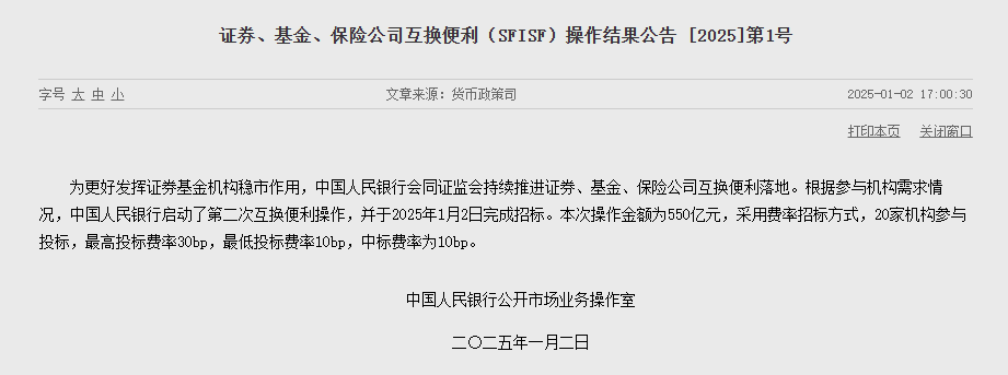 新年伊始,资本市场迎来了货币政策工具的新进展!1月2日傍晚,央行正式发布了证券、基金、保险公司互换便利(SFISF)操作结果公告[2025]第1号。