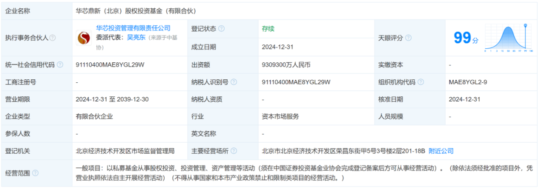 电路产业投资基金三期股份有限公司(简称大基金三期)再度发力。据天眼查数据显示,2024年12月31日,华芯鼎新(北京)股权投资基金(有限合伙)正式成立,出资额精确至930.93亿元,由大基金三期携手华芯投资管理有限责任公司(简称华芯投资)共同出资设立。该基金的经营范围涵盖以私募基金形式从事股权投资、投资管理、资产管理等活动,并由华芯投资担任执行事务合伙人。
