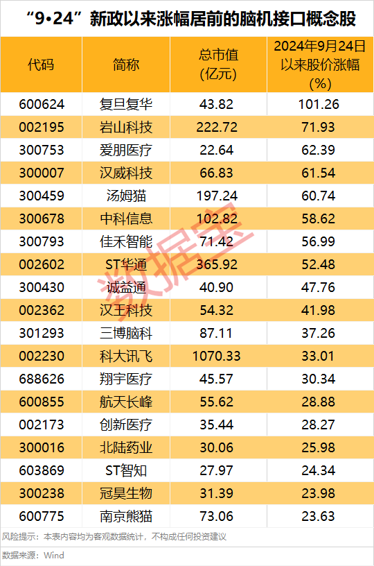 据证券时报·数据宝统计,在2024年交易日中,尽管脑机接口概念股股价平均下跌5.5%,但仍有岩山科技、中科信息、航天长峰、汤姆猫、复旦复华等5只股票的股价涨幅超过10%。其中,岩山科技股价涨幅最大,累计上涨29.79%。复旦复华自2024年“9·24”新政以来,区间涨幅达101.26%,其脑机接口技术已在临床试验中取得初步成功。