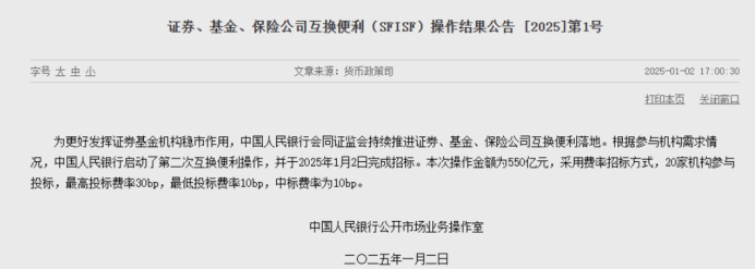 回顾2024年12月31日,央行宣布将实施第二次互换便利操作,证监会也同步宣布将扩大互换便利参与机构的范围至20家。仅仅两天后,即2025年1月2日,央行再次发布消息,根据参与机构的需求情况,已启动并完成第二次互换便利操作的招标。此次操作规模达到550亿元,采用费率招标方式,共有20家机构参与投标,中标费率低至10bp。