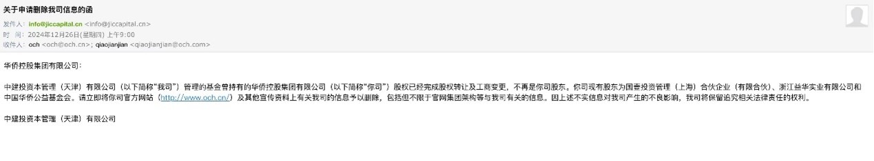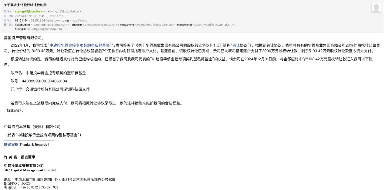 此外,嘉国资产受让股权时仅支付了部分转让款,剩余款项一直未付。中建投在邮件中威胁将采取法律措施,但截至发稿时,尾款仍未支付。爆料还显示,中建投在华侨系暴雷前夕“精准”退出其中一家公司,但股东架构在官网上仍未更新。
