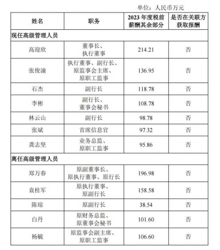 加上已领取的薪酬,平安银行的杨志群、胡跃飞、项有志和原副行长郭世邦2023年实际税前薪酬均超过500万元。民生银行的高迎欣和郑万春实际税前薪酬也分别达到587.73万元和529.62万元,尽管高迎欣的薪酬较2022年有所下降。