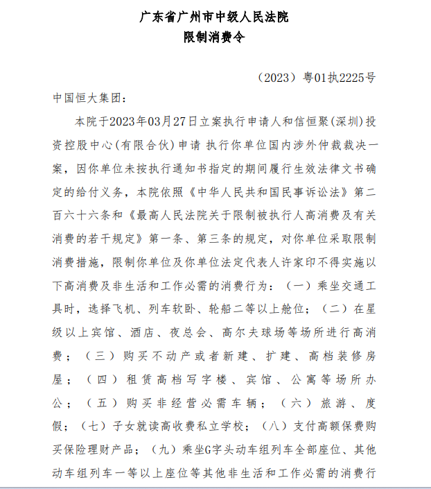 实际上,这已不是中国恒大集团和许家印第一次被限制消费。2024年3月18日,中国恒大集团就曾因未按执行通知书指定的期间履行生效法律文书确定的给付义务,被咸宁市中级人民法院发出限制消费令。同年11月,广州市南沙区人民法院也对中国恒大及许家印采取了限制消费措施。