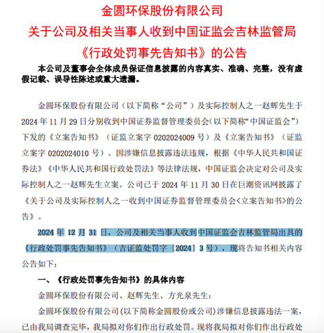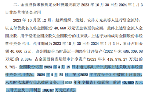 因涉嫌信息披露违法违规,金圆股份及其实际控制人之一赵辉在被立案调查一个半月后,于1月2日公告披露,吉林证监局拟对公司及赵辉作出行政处罚。据吉林证监局查明,金圆股份未按规定及时披露关联方金圆控股集团有限公司2023年10月30日至2024年1月3日非经营性资金占用情况,累计占用金额4.066亿元。