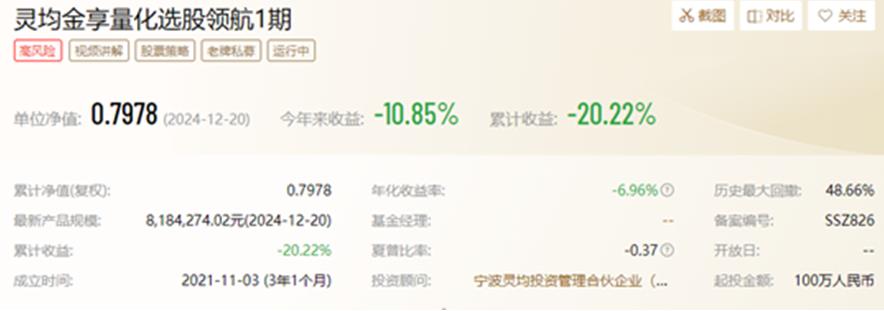 具体来看,灵均金享量化选股领航1期、灵均进取多策略L期等基金表现不佳,年内收益率分别下跌10.85%和10.17%。灵均金享量化选股领航1期自2021年11月3日成立以来,累计收益率亏损已达20.22%,且在2024年9月13日出现了自成立以来的最大回撤值-47.04%。