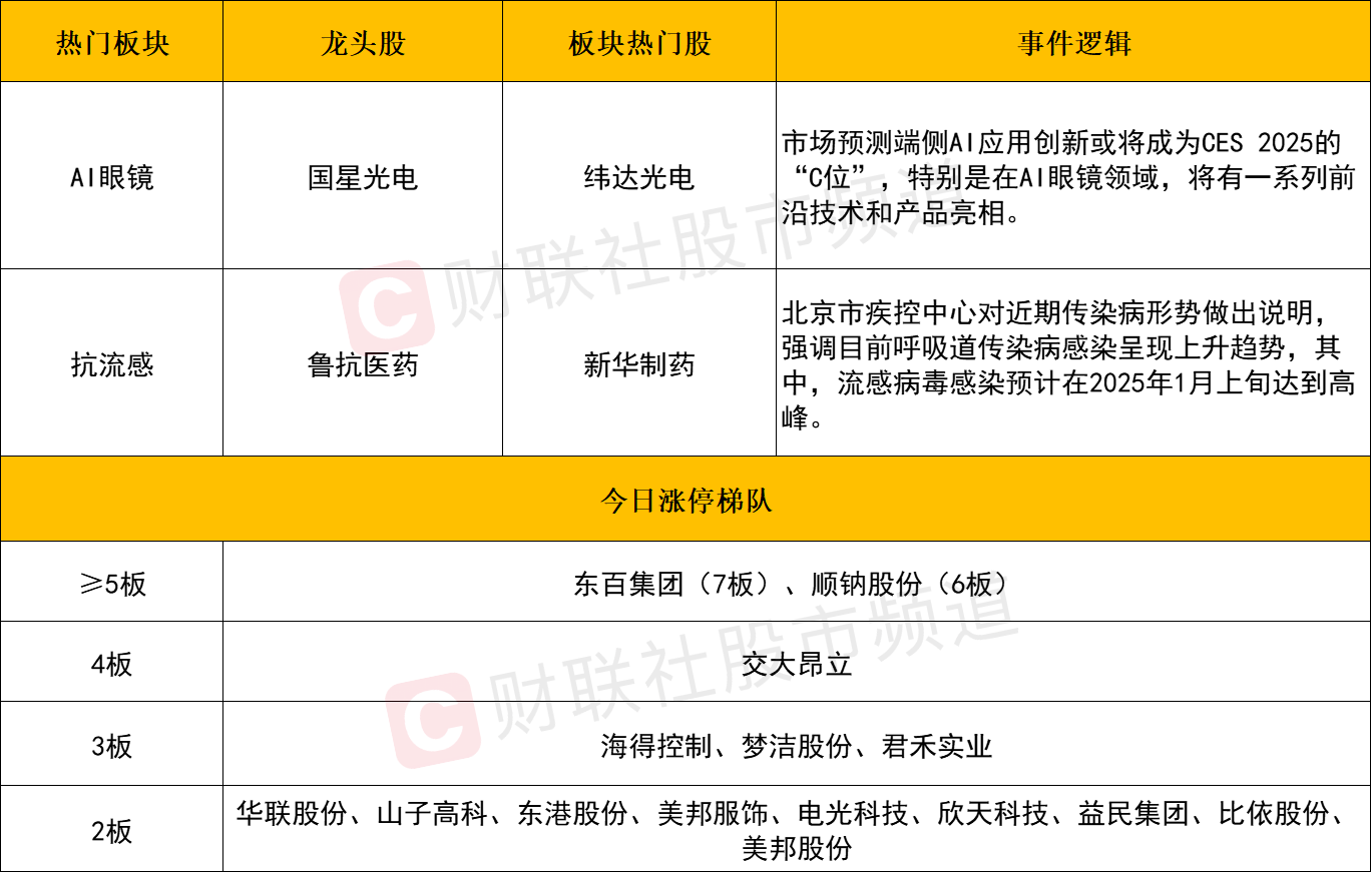 AI眼镜概念股活跃,思泰克、比依股份等多只个股涨停,市场预测端侧AI应用创新将成为CES 2025的焦点,特别是AI眼镜领域。业内认为2025年有望成为AI眼镜元年,AI智能眼镜将快速渗透传统眼镜市场。该板块展现出较强韧性,成为科技股中的亮点。然而,市场整体尚未止跌,热点题材的延续性难以保障,预计下周AI眼镜板块的博弈将加剧。