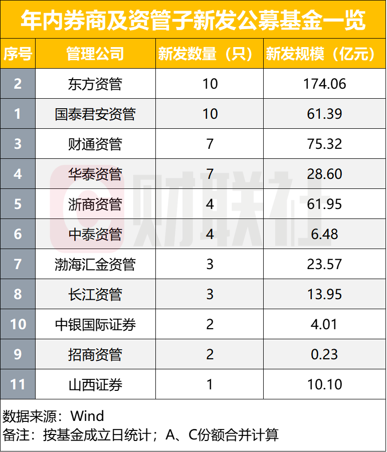 具体来看,2024年共有9家资管子公司和2家证券公司参与了公募基金新发,包括国泰君安资管、东方资管、财通资管、华泰资管、浙商资管、中泰资管、渤海汇金资管、长江资管、招商资管、中银证券以及山西证券。其中,国泰君安资管和东方资管各发行10只公募基金,并列第一;财通资管和华泰资管紧随其后,各发行7只;浙商资管和中泰资管各新发4只,渤海汇金资管和长江资管各发行3只,中银证券和招商资管各2只,山西证券1只。