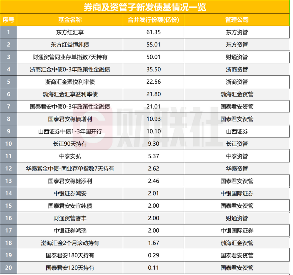 东方资管发行的“东方红汇享”与东方红益恒纯债基金分别以61.35亿元和55.01亿元的规模占据新发债券型基金的前两位。财通资管同业存单指数7天持有、浙商汇金中债0-3年政策性金融债、浙商汇金聚悦利率债、渤海汇金汇享益利率债及国泰君安中债0-3年政策性金融债等7只基金规模均超过20亿元。