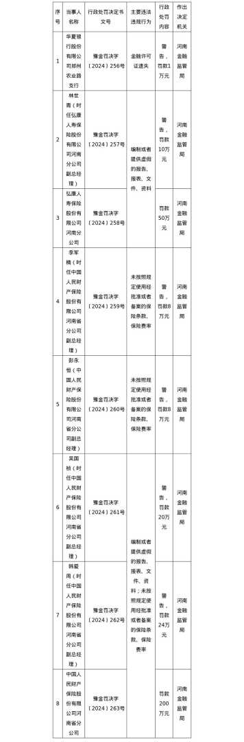蓝鲸新闻1月3日讯,近日,河南省金融监管局连续开出8张严厉罚单,针对华夏银行股份有限公司郑州农业路支行、弘康人寿保险股份有限公司河南分公司以及中国人民财产保险股份有限公司河南省分公司及其多位高管展开处罚。