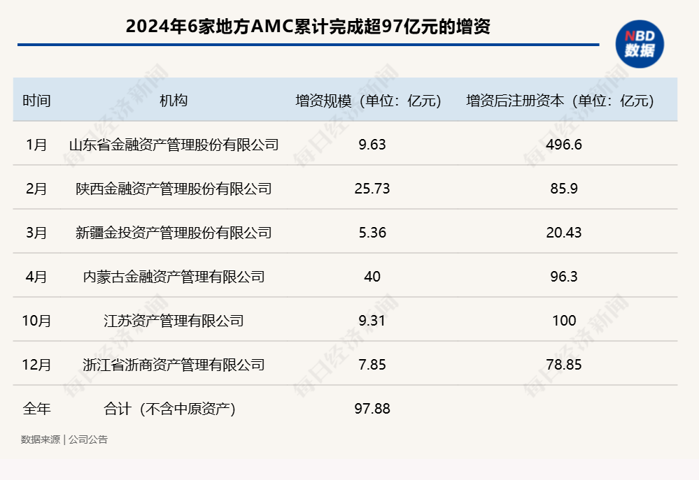 回顾2024年,地方资产管理公司(简称“地方AMC”)的增资热情依然高涨。《每日经济新闻》记者根据公开信息统计,至少有6家地方AMC在2024年内累计完成了近97亿元的增资,延续了前两年“增资潮”的强劲势头。