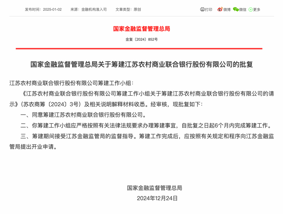 2025年1月2日,金融监管总局正式公告,批准江苏农村商业联合银行股份有限公司(简称江苏农商联合银行)的筹建工作。这一决定标志着江苏省农村信用社体系改革迈出重要一步。