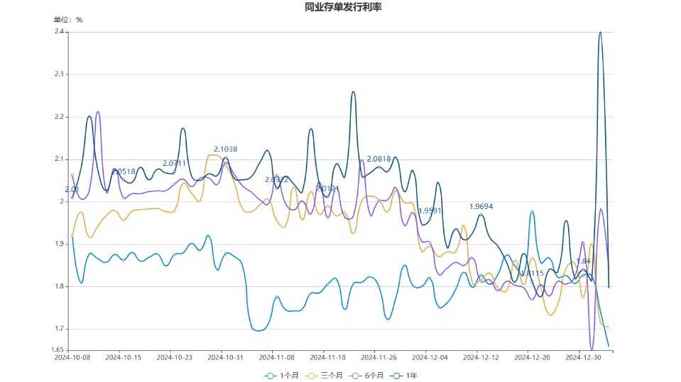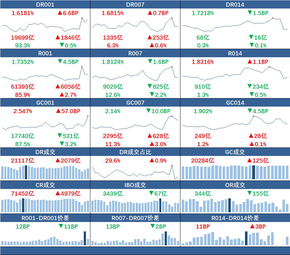 在银行间质押式回购市场,短期资金利率呈现出涨跌不一的态势。DR001和R001的加权平均利率分别上行6.6个基点和下行4.5个基点,报1.6181%和1.7352%,成交额分别增加1846亿元和6056亿元。DR007和R007的加权平均利率则分别上行0.7个基点和下行1.6个基点,报1.6815%和1.8124%,成交额分别增加253亿元和减少825亿元。DR014和R014的加权平均利率分别下行1.5个基点和上行1.1个基点,报1.7218%和1.8316%,成交额分别减少16亿元和234亿元。