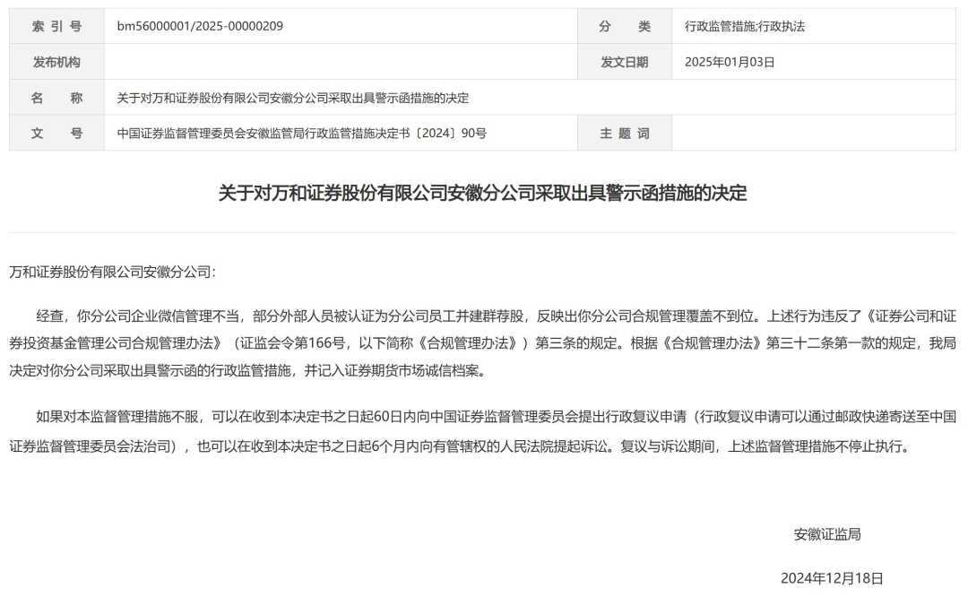 1月3日,安徽证监局发布公告,对万和证券安徽分公司及其负责人戎本翔采取出具警示函措施。原因是该分公司企业微信管理存在漏洞,导致部分外部人员被认证为员工并建群荐股。这一行为违反了《证券公司和证券投资基金管理公司合规管理办法》的相关规定,反映出分公司在合规管理方面的不足。