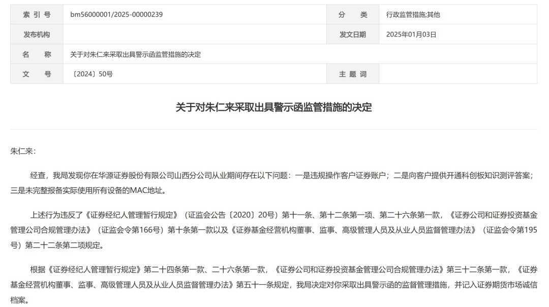 1月3日,山西证监局公告对华源证券山西分公司员工朱仁来采取出具警示函的罚单。朱仁来存在违规操作客户证券账户、向客户提供科创板知识测评答案、未完整报备设备MAC地址等多项违规行为。这些行为严重侵犯了客户权益,破坏了科创板投资者适当性管理,违反了证券公司设备管理相关规定。