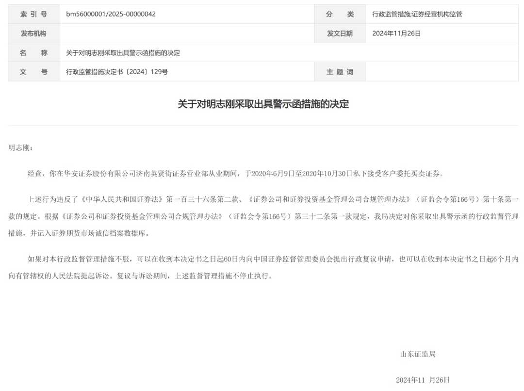 1月2日和3日,山东证监局和安徽证监局分别公告对华安证券济南英贤街证券营业部员工明志刚和合肥高新区证券营业部负责人李杰采取出具警示函措施。明志刚私下接受客户委托买卖证券,严重违反了证券行业规定。而李杰所在营业部存在员工代客理财下单操作的情况,违反了合规管理办法。