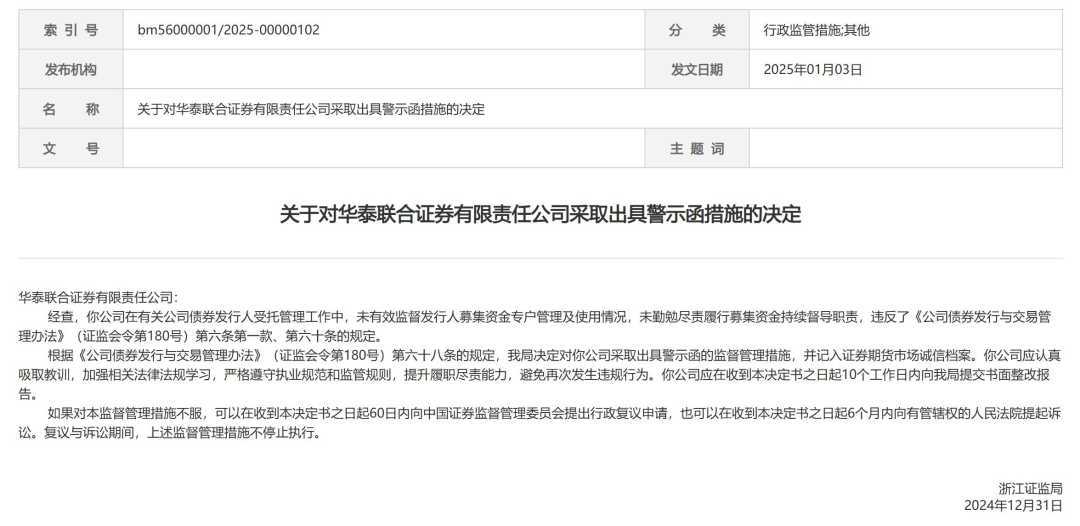 1月3日,浙江证监局公告对华泰联合证券采取出具警示函的监督管理措施。原因是华泰联合证券在公司债券发行人受托管理工作中严重失职,未能有效监督发行人募集资金的使用情况,并在履行募集资金持续督导职责方面未做到勤勉尽责。这一行为违反了《公司债券发行与交易管理办法》的相关规定。